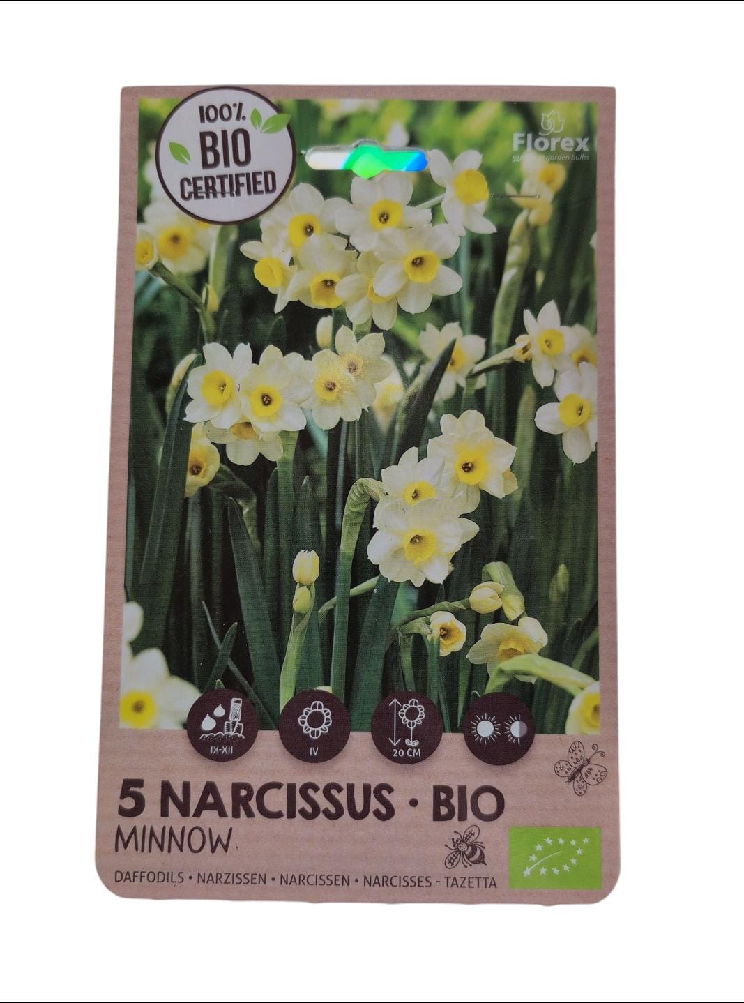 Bio Narcis Minnow is een charmante, laagblijvende narcis met zachte gele bloemetjes en een lichte geur. Deze biologische bloembollen zorgen elk voorjaar voor een vrolijk en natuurlijk accent in de tuin, border of bloempot.